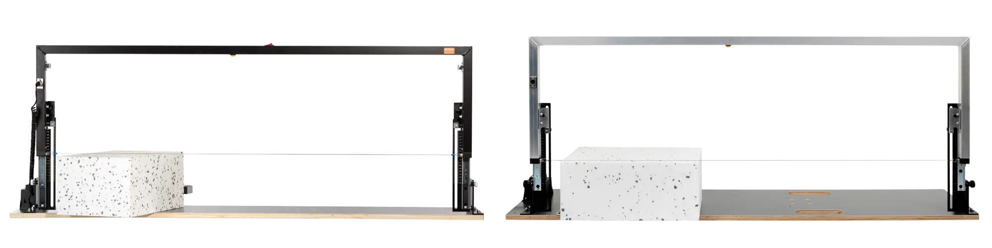 A small but crucial detail: the HWS-Easy 2! foam cutter is equipped with limit stop sliders that lock the cutting bow at a fixed height for precise longitudinal cuts. For example, a 340mm polystyrene board can be split into two 170mm sections without any additional measuring.